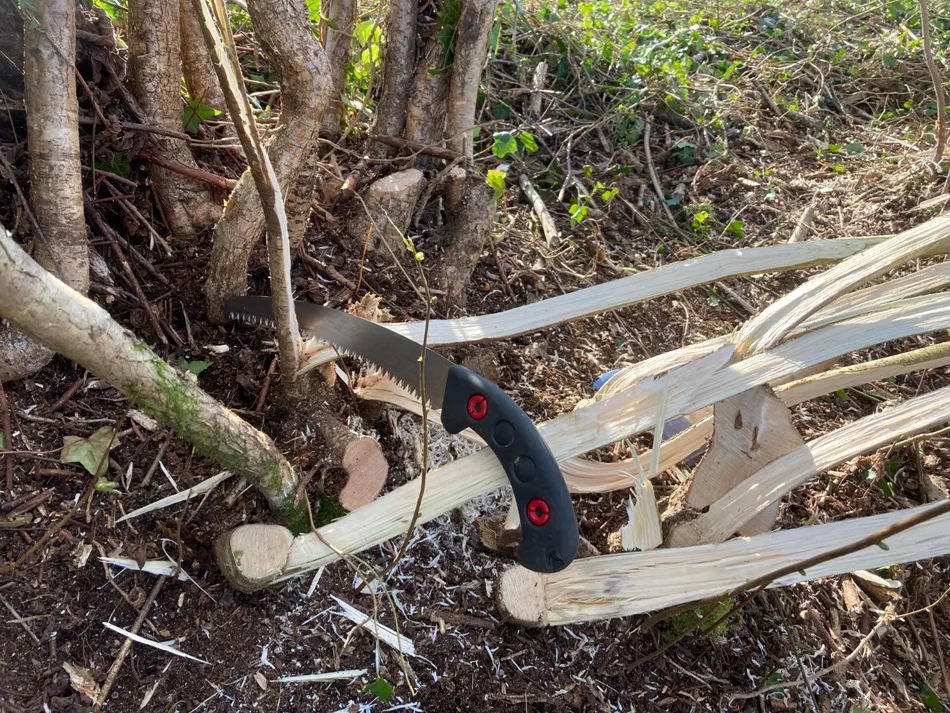 The process of laying is slow but satisfying work. Dead or poorly-shaped growth is removed, and the best stems are partially cut and laid over to form a living structure that will regenerate from the base. Hazel is by far the easiest species to work with, producing long, straight stems that split readily – one of the reasons it has been used for centuries in hurdle making and thatching spars.