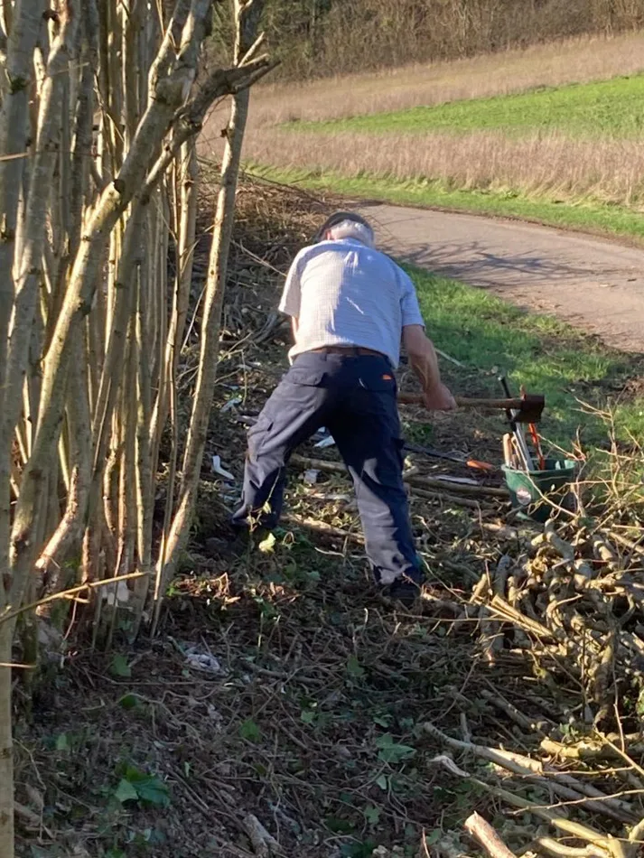 Our good friend George D has been steadily working his way along an overgrown hazel hedge beside Lime Kiln field, along the road to Shepherds Corner, rejuvenating it by laying. Over the past few years he has patiently reintroduced me to the skills involved – it is a long time since my own hedge-laying course by the cricket ground in Moreton back in 2002.