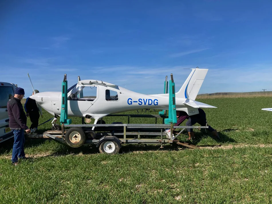 The pictures below are of a surprise visitor one Friday evening in March. The pilot had to make a hurried landing when the engine faltered – luckily for him the winter wheat crop on the Knoll presented itself, with room to land before the wires. Exactly a year ago this field had just been sown with oats, and the soft soil would have caused the plane to sink in – the landing might not have been so comfortable. Attempts to restart the engine were not rewarded with smooth running, so eventually she had to be loaded up and driven home.