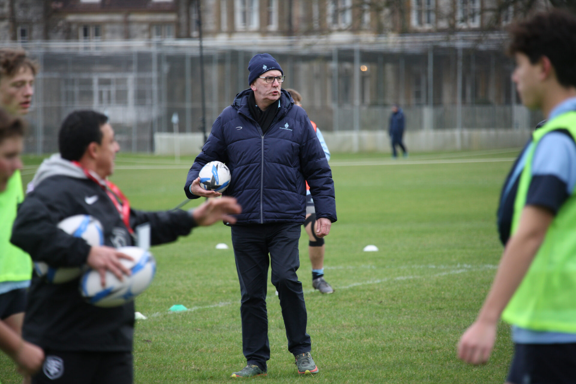 No doubt sensing the opportunity to impress, boys from Clayesmore, Monkton Combe and St Edwards Bath were willing participants in a session demonstrating a very different style from the simplistic collision-based game many modern coaches are fixated by – but eschewed by legendary Toulouse and France coach Pierre Villepreux.