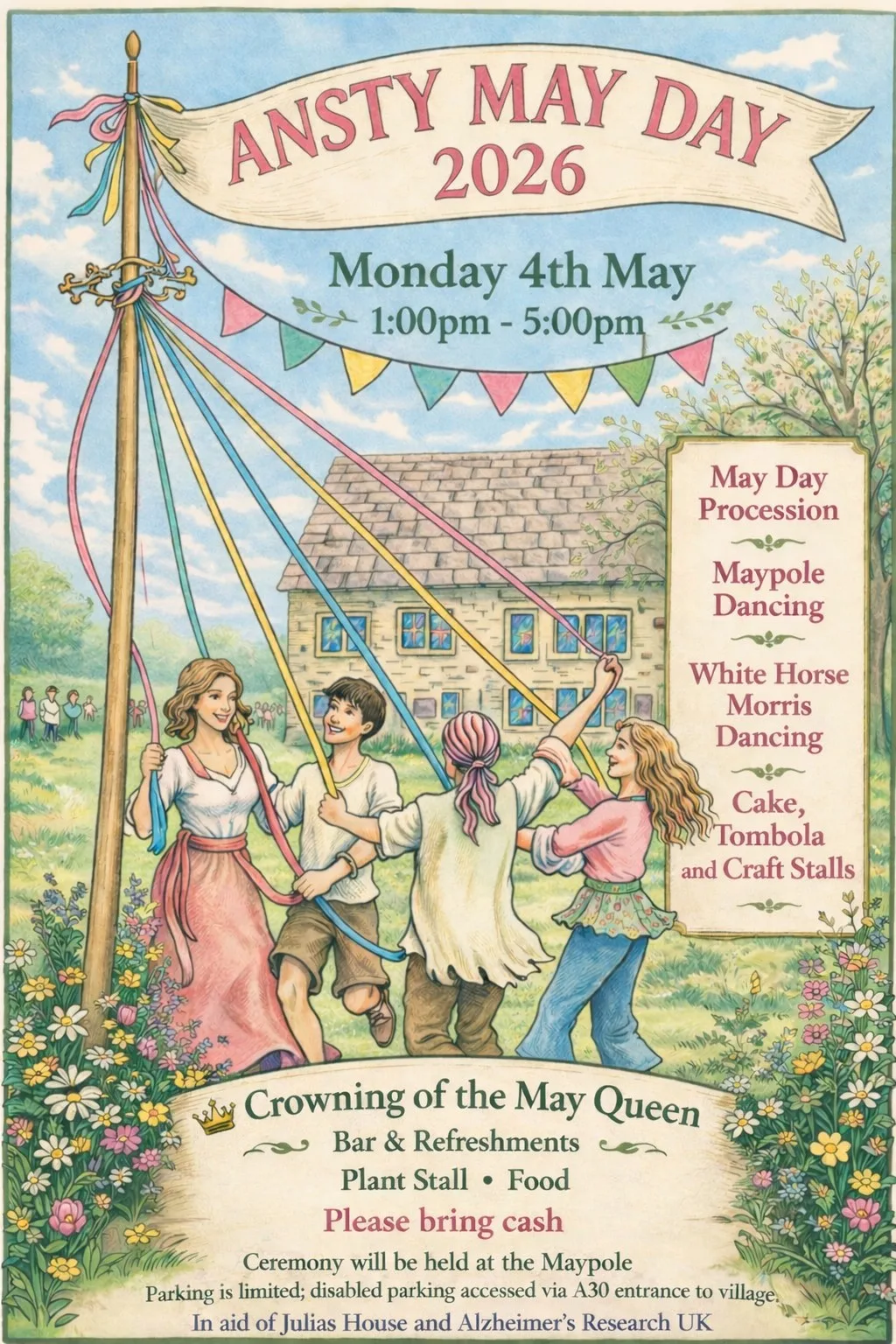 Proceeds from the day will go towards maintaining the May Day tradition, including future upkeep of the Maypole, as well as supporting Julia’s House and Alzheimer’s Research UK. Further details can be found at anstywiltsparish.gov.uk.