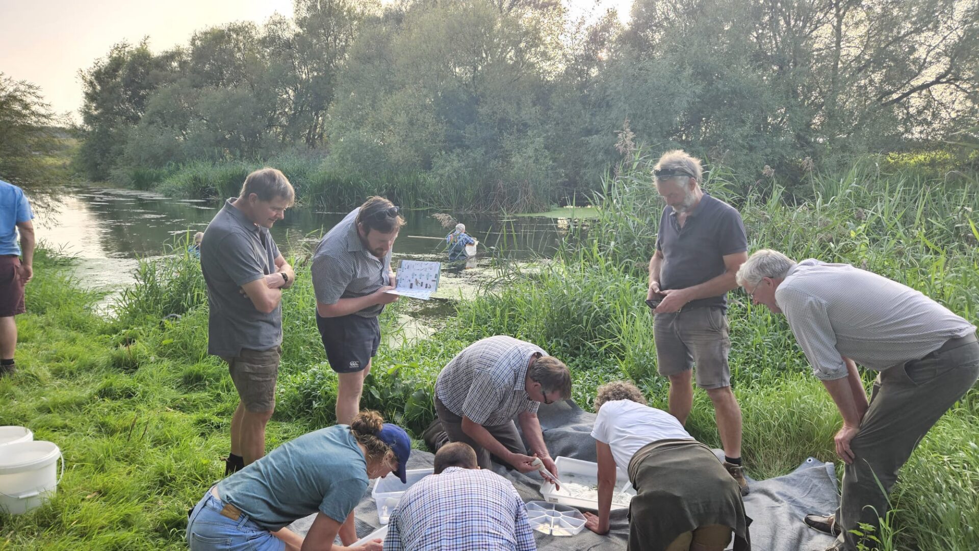 A popular Farmer Cluster meeting was held in late summer on the Tory family’s land by the Stour at Shapwick, led by Nicola Hopkins of Dorset FWAG (Farming and Wildlife Advisory Group). She had two of us wade into the river with waders and nets to see what we could find on the river bed. We then passed the nets ashore for emptying and sorting, before spending ages trying to identify what we had found!