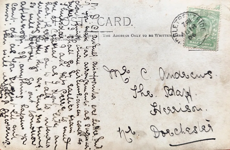 The Green Dragon is still recognisable today, though it is better known now as The Piddle Inn. The 1906 postcard was sent from the village to Mr C Andrews, simply addressed ‘The Staff, Herrison, Nr Dorchester’. Herrison House was the Dorset County Asylum. Opened in 1863, 1904 had seen the opening of Herrison House for private patients and by 1913 there were 957 patients at Herrison Hospital.