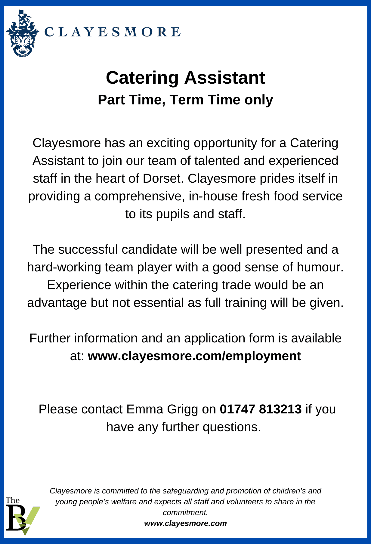 Clayesmore has an exciting opportunity for a Catering Assistant to join our team of talented and experienced staff in the heart of Dorset. Clayesmore prides itself in providing a comprehensive, in-house fresh food service to its pupils and staff.