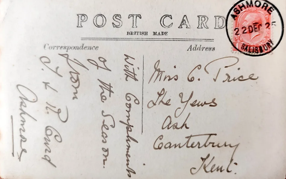 The message on the back of this card – sent to Miss Price in Canterbury – is brief but seasonal:
