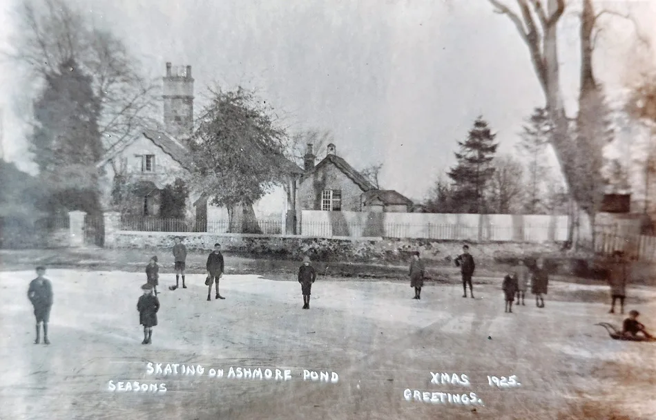 This postcard, sent 22nd December 1925, captures a rare but much-loved Dorset winter pastime: skating on Ashmore’s village pond. Though the scene is captioned, it would have been instantly recognisable to locals even without it – the surrounding cottages look much the same today.