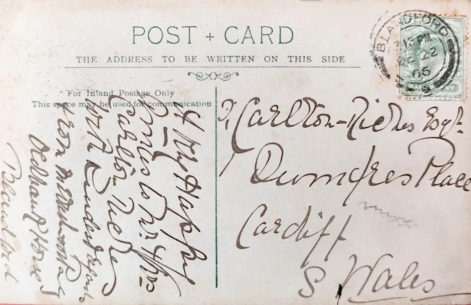 ‘A Very Happy Xmas to Mr & Mrs Carlton Riches with kindest regards from M Wichwood [Pag?], Old Bank House, Blandford’