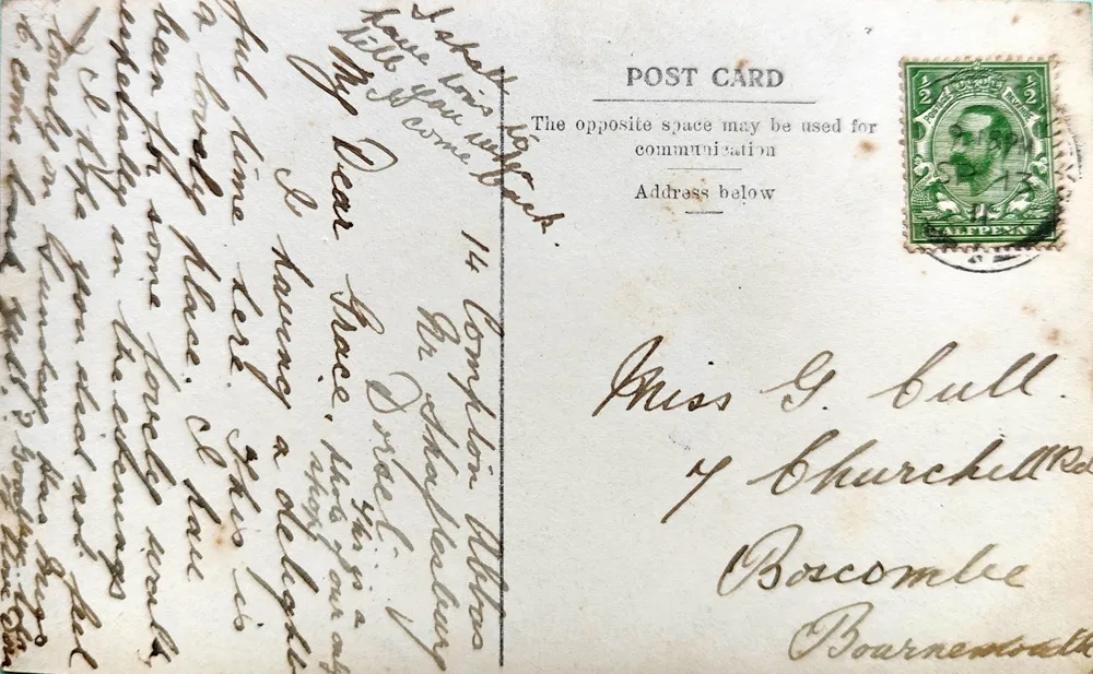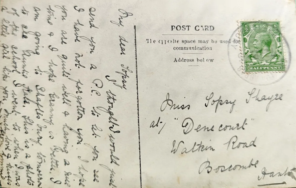 Taken by a photographer standing on what is now the main A357, Compton Abbas School – now the village hall – was built in 1849 and listed in 1960. Another card sent to Boscombe by a holidaymaker, this time in September 1915, it is addressed to Miss Topsy Shayze. A mysterious figure, “Shayze” seems to be part of Topsy’s nickname, as no such surname appears in any census. Denecourt is still a substantial house in Boscombe, though is now divided into five flats.