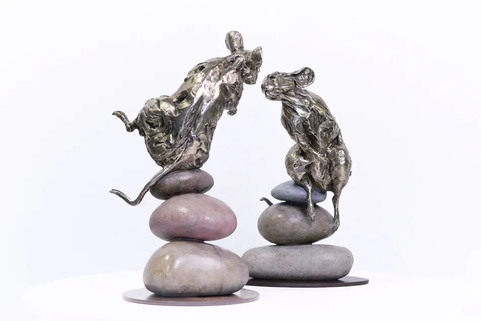 By contrast, Kissing Mice is a more intimate study in vulnerability and balance. Perched delicately on stacked pebbles, the two mice lean towards one another in a quiet moment of affection. One is older, more watchful; the other curious, reaching. Cast in white bronze, it’s a piece that invites viewers to pause and reflect.