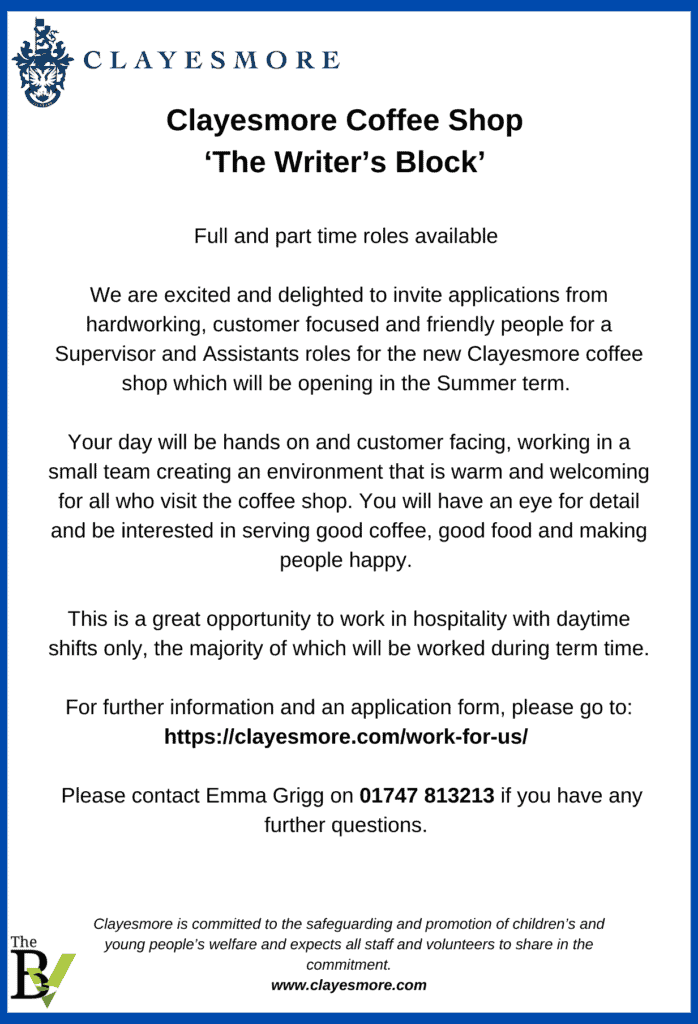 We are excited and delighted to invite applications from hardworking, customer focused and friendly people for a Supervisor and Assistants roles for the new Clayesmore coffee shop which will be opening in the Summer term.