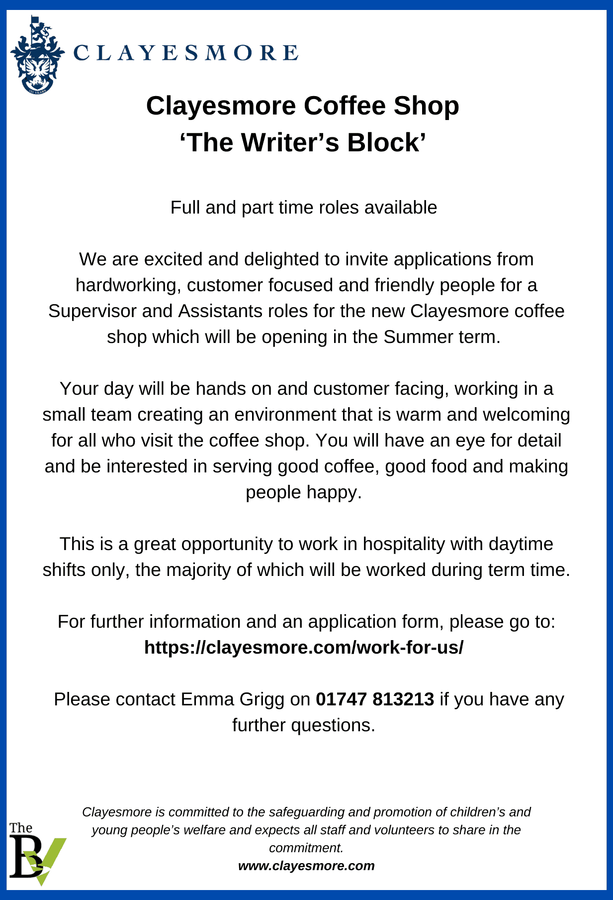 We are excited and delighted to invite applications from hardworking, customer focused and friendly people for a Supervisor and Assistants roles for the new Clayesmore coffee shop which will be opening in the Summer term.