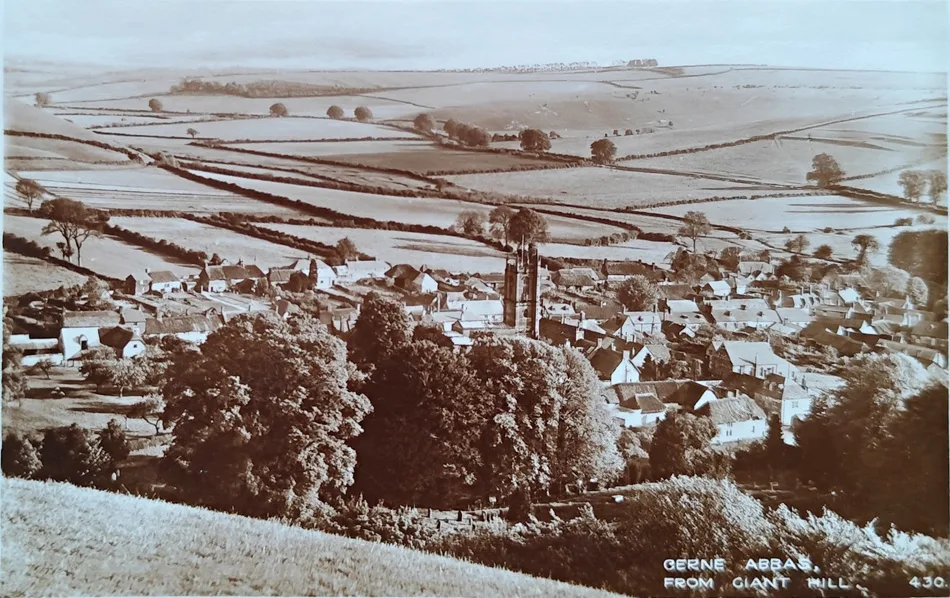 A 1938 postcard captures Cerne Abbas in a quiet in-between moment: after decline, before revival – when the Giant didn’t warrant a mention