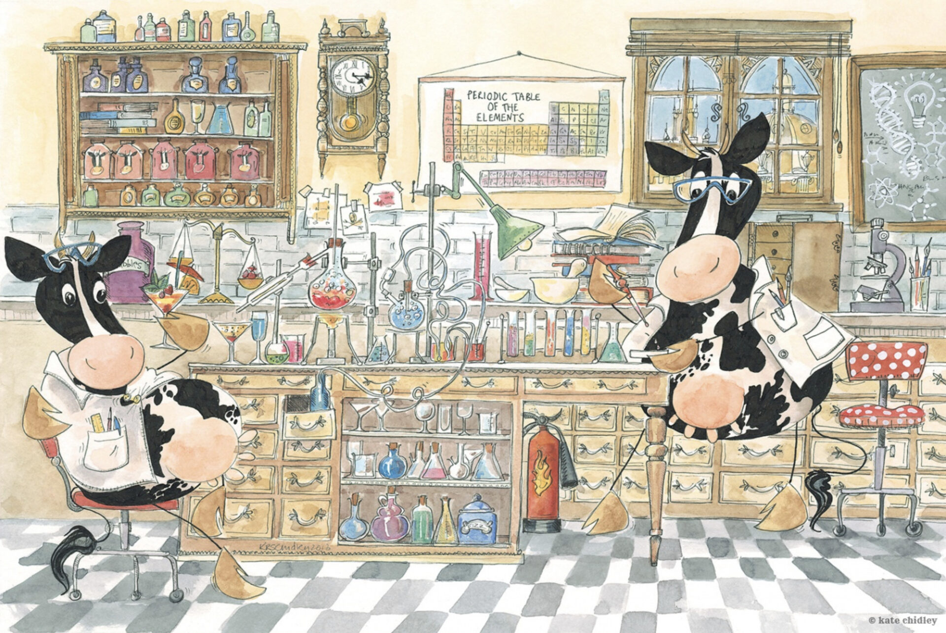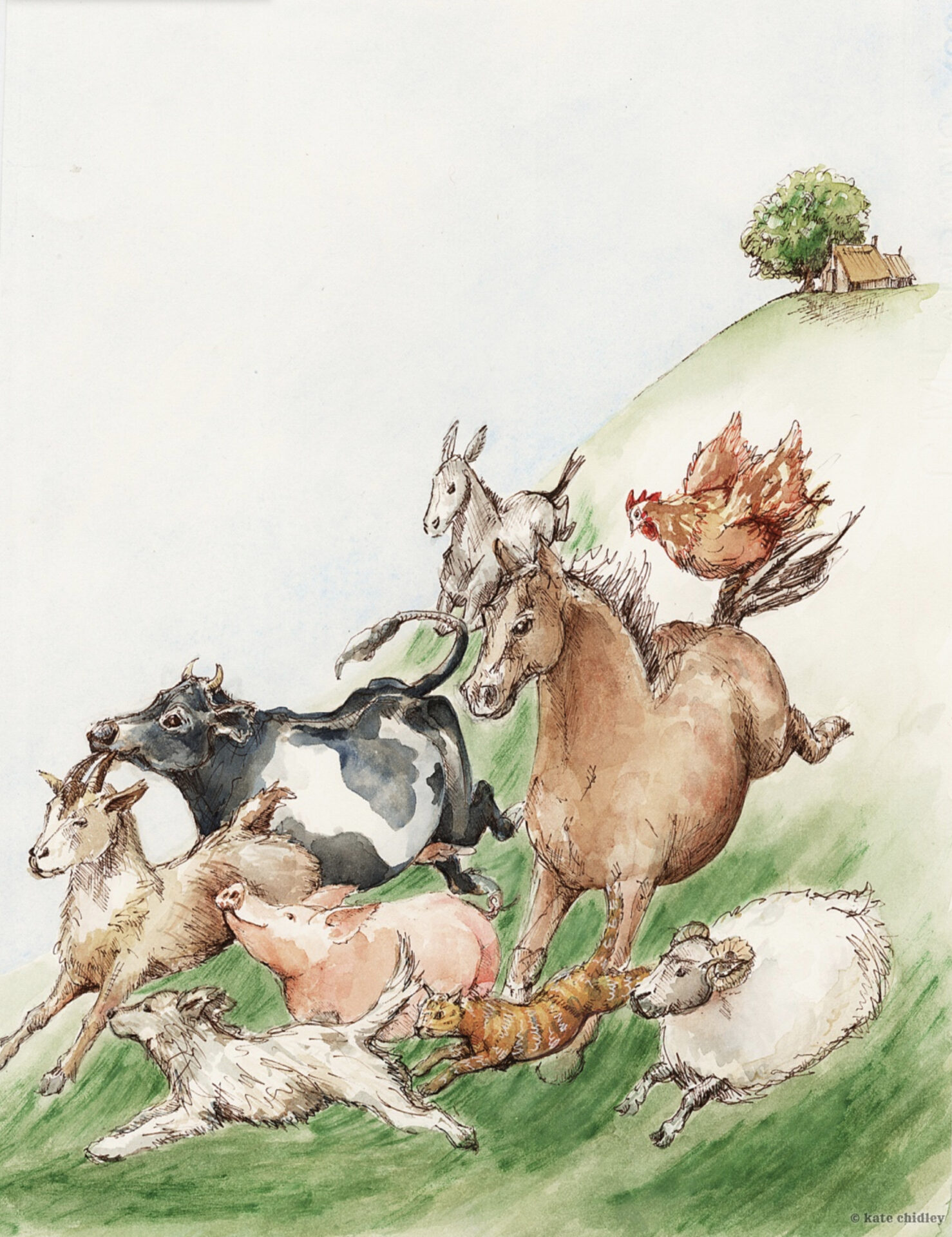 Kate’s art fits comfortably into this eclectic setting – she has an eye for the quirky and the unusual, with hints of folklore and magic, country tales and curious characters, ancient sites and historic buildings, cows in fields or jumping over the moon … In fact her farmer father encouraged her artistic inclinations, suggesting she would be better off painting cows than milking them.