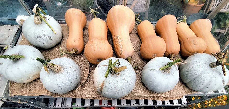 Winter squashes – On 9th October we harvested seven Crown Prince and eight butterfly butternut (the largest weighed 8lbs!)