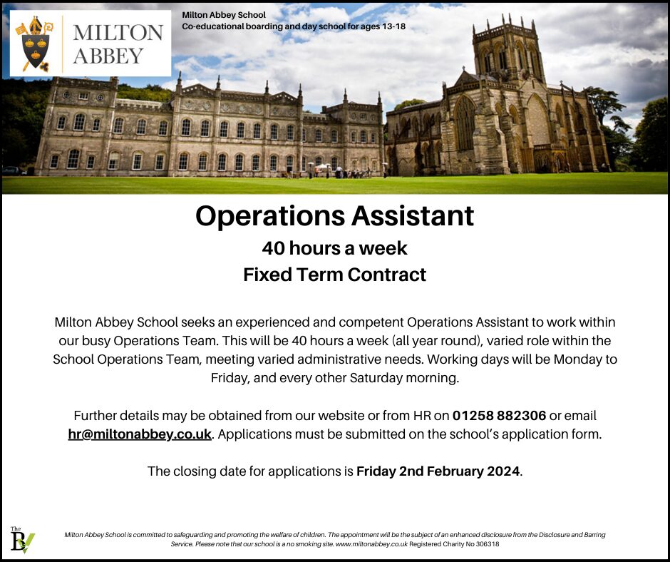 Milton Abbey School seeks an experienced and competent Operations Assistant to work within our busy Operations Team. This will be 40 hours a week (all year round), varied role within the School Operations Team, meeting varied administrative needs. Working days will be Monday to Friday, and every other Saturday morning.