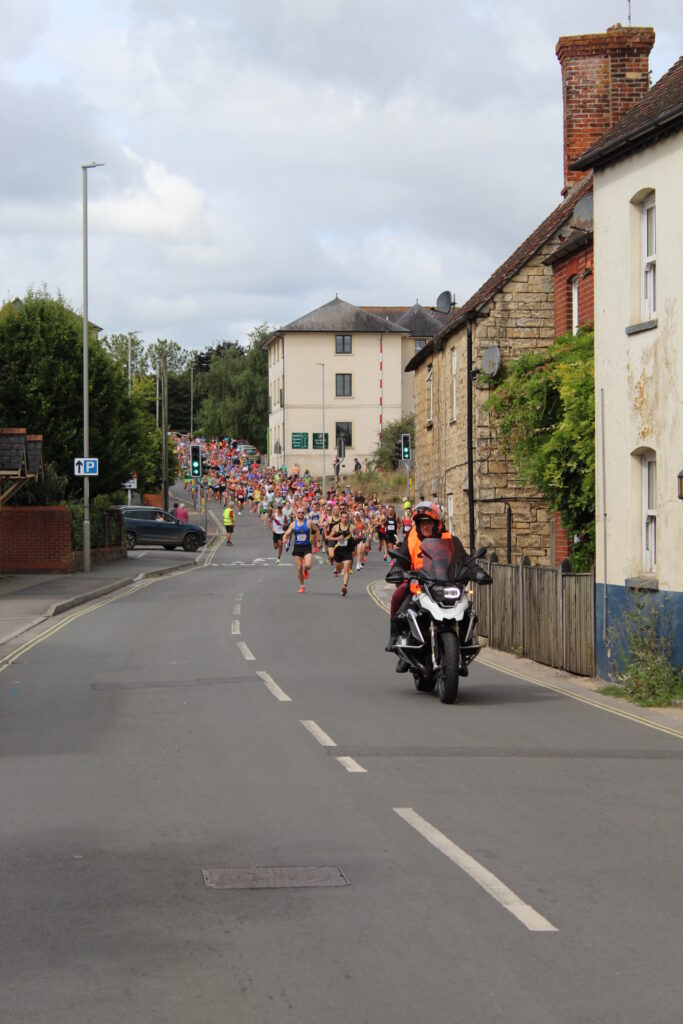 The race is over, and there were 360 entries, with 319 finishers in the half marathon – a fantastic turnout! Thomas Corbin of Poole AC was the overall winner of the race, in a brilliant winning time of 1:12:12. First lady was Vicki Ingham from Poole Runners, in a time of 1:22:41. The first local runners were Rich White of Dorset Doddlers and Emma Mogridge – who has since joined the Doddlers! The oldest runners were Geoff Scott of Poole Runners and Patricia Seabrook of Finch Coasters. A big thank you to Ruby Else-White, our local European Youth Boxing Champion, who started both races before helping at a water station with other young boxers from Stur ABC. Unfortunately she had an important football match in the afternoon, so couldn’t help at the presentation, but her fellow boxer, National Champion Freddie Norman, stepped in. Another huge thank you to Honeybuns, who have been providing the runners with race cakes for more than 20 years – this year an even bigger Team Honeybun took part in the race too! Our local supporters must be mentioned – the High School, Harts of Stur and Barbers Cheese for the local prizes, and Root & Vine in town for supplying the oranges. Thank you to Race Timing Solutions, who organised the race entries and results. They also made our medals and trophies. Richard & Tracy White, from On The Road Motorcycle Training, opened the course, followed by our lead cyclists, Shams Wahab, Sara Cross and Andrew Cross. Following at the back were our sweepers – the two Richards, who made sure everyone came in under three hours. An exception was made for Patricia Seabrook of the Finch Coasters: at 85 she was our oldest runner. She knew she would take a bit longer, so she started an hour earlier … and still finished in just over three and half hours! Around the course were marshals and water stations manned by The Blackmore Vale Lions, Run Blandford, Doddlers – some in fancy dress – and lots of friends and family. Our race village provided refreshments from The Really Tiny Coffee Co: as always we were provided with excellent barista coffee. Lindsey from Big Bun, Little Bun did a very good job of refuelling the runners and helpers after the race, and Peter looked after rehydration at our own Doddler Running Bar. Massage was provided by Pete from Pete’s Functional Fitness Club, with proceeds going to help Julia’s House Hospice. While the race was in progress the children were entertained with fun races on the school field and then enjoyed a free Fat Sam’s Ice-Cream. The Vale Pantry joined forces with us by collecting donations of unwanted new running kit – thank you to all who donated, this will help others get into running, a sport that we all love.