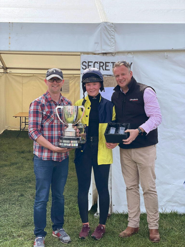 Alice and Golden Poet won the Cattistock Ladies open at Chilfrome in April 2023 –Alice pictured with trainer Keiran Burke (left) and the race sponsor
