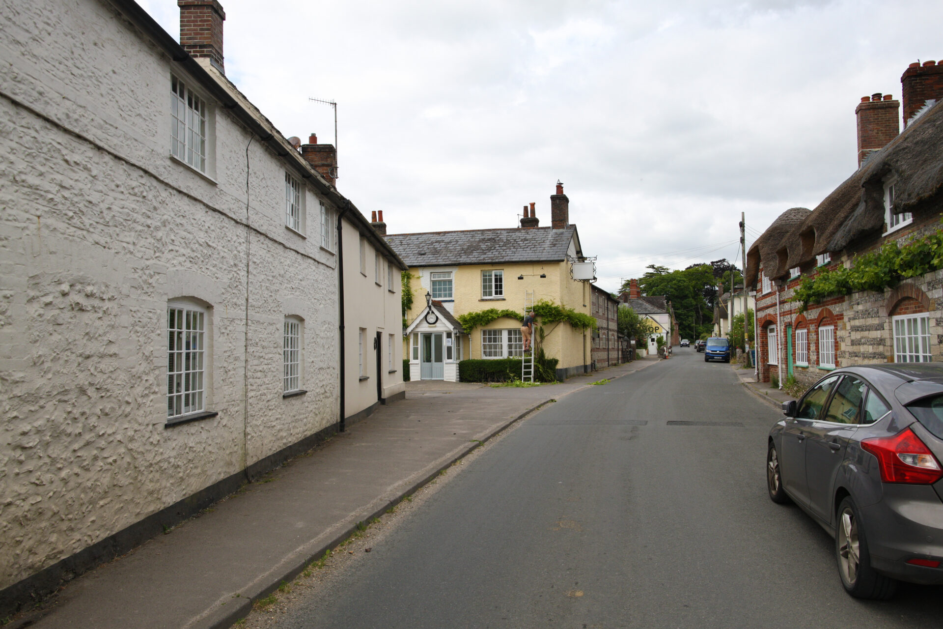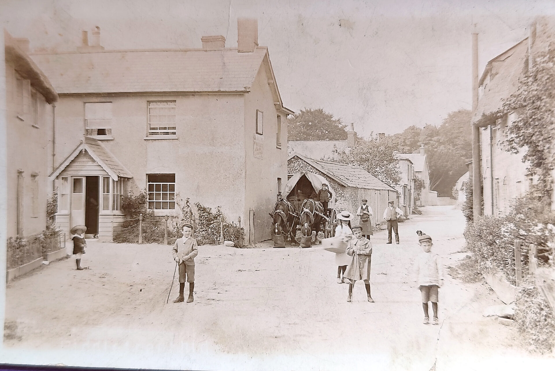 The Piddle Inn has changed little and is still instantly recognisable, though behind where the horses enjoy their lunch the outbuilding has made way for an extension and some pavement.On the left, the building which now holds Jaspers Salon is a newer extension to the cottages in the ‘then’ image