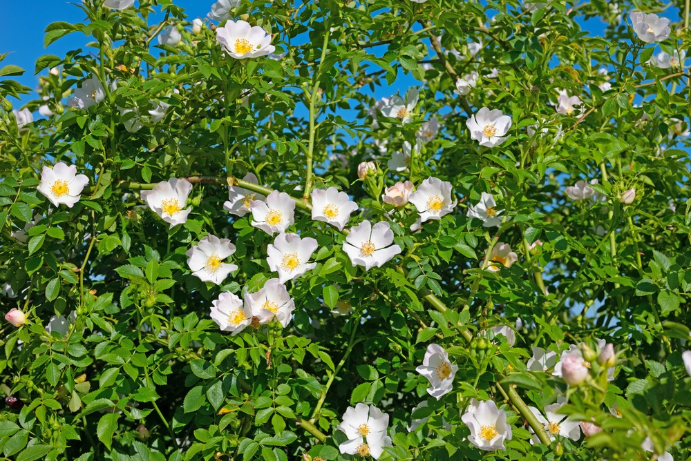 Our native dog rose, rosa canina, is a scrambling rose with delicate pink flowers which, if left will produce beautiful rose hips, eaten by a wide range of birds – they stay juicy until late winter