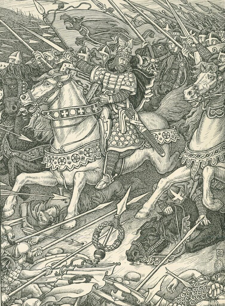 Arthur Leading the Charge at Mount Badon by George Wooliscroft Rhead and Louis Rhead. From Tennyson’s Idylls of the King: Vivien, Elaine, Enid, Guinevere, 1898