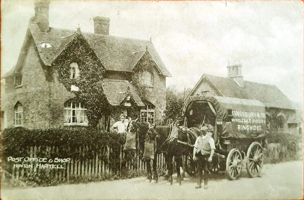 n the image, the grocer’s horses have paused for a lunch snack at Hinton Martell Post Office and Shop – the 1855 Kelly’s Directory for Ringwood lists a ‘Kingsbury, John Biles & Sons, grocers, cheese factors, tallow chandlers & provision merchants, High Street’. By the 1911 directory they have become ‘Kingsbury & Co. wholesale grocers’, and have moved address to Friday’s Cross.