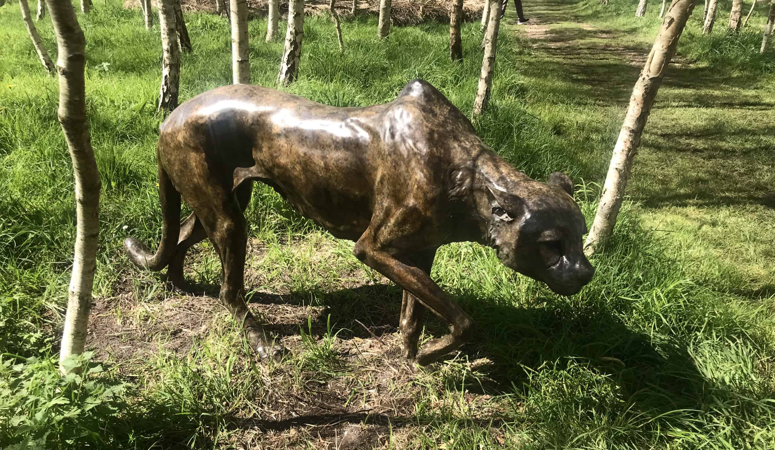 Beautiful ‘Mouse in a Pod’ Some of my favourite pieces in the Gallery were by Adam Binder. I especially loved his ‘Mouse in a Pod’. The little mouse could be removed from his pea pod to nestle in one’s hand! Adam is one of Britain’s leading wildlife sculptors, whose signature fluid style of simple lines and flowing forms depicts both movement and emotion that beautifully captures the essence of his subjects. He has said ‘Nature is my passion and my constant distraction.’ There is an interesting story behind Nadine Collinson’s ‘To The Stars!’; the maquette for the full-size sculpture installed at the Silverlake Holiday Estate in Warmwell. Simon is soon hoping to install one of the editions on the lake at Pallington. Silverlake was a former RAF base and the piece was created as a homage to the RAF and the Spitfire, as well as a celebration of the local birdlife. The Spitfire’s acrobatic performance is represented in the looping trails of the birds which create a ring reflecting the RAF badge. As I made my way into the garden and towards the lakes I found Jane Shaw’s ‘Sherlock, the Mountain Goat’. She told me “The goat stands proud with attitude and comes alive when the sun brings out the vibrancy of the rust colour, bouncing off from the green surrounds. We have featured Jane’s work in the past and she has several more sculptures in the exhibition including ‘Electric Blue Hare’ and ‘Forever Friends’. “There is a huge number of unspoken words being said between the two lurchers in ‘Forever Friends’.” Jane went on ”and the hare is about to turn the corner at speed, provoking a feeling of energy and joy for anyone who manages to catch his glance.”