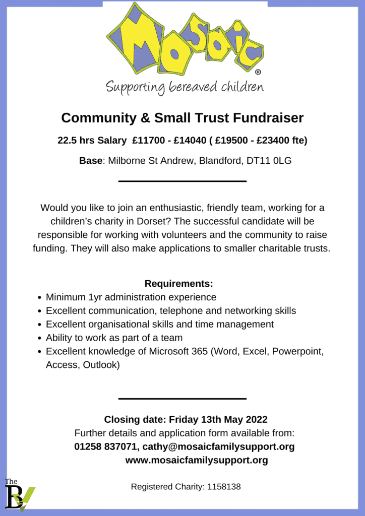 Would you like to join an enthusiastic, friendly team, working for a children’s charity in Dorset? The successful candidate will be responsible for working with volunteers and the community to raise funding. They will also make applications to smaller charitable trusts.