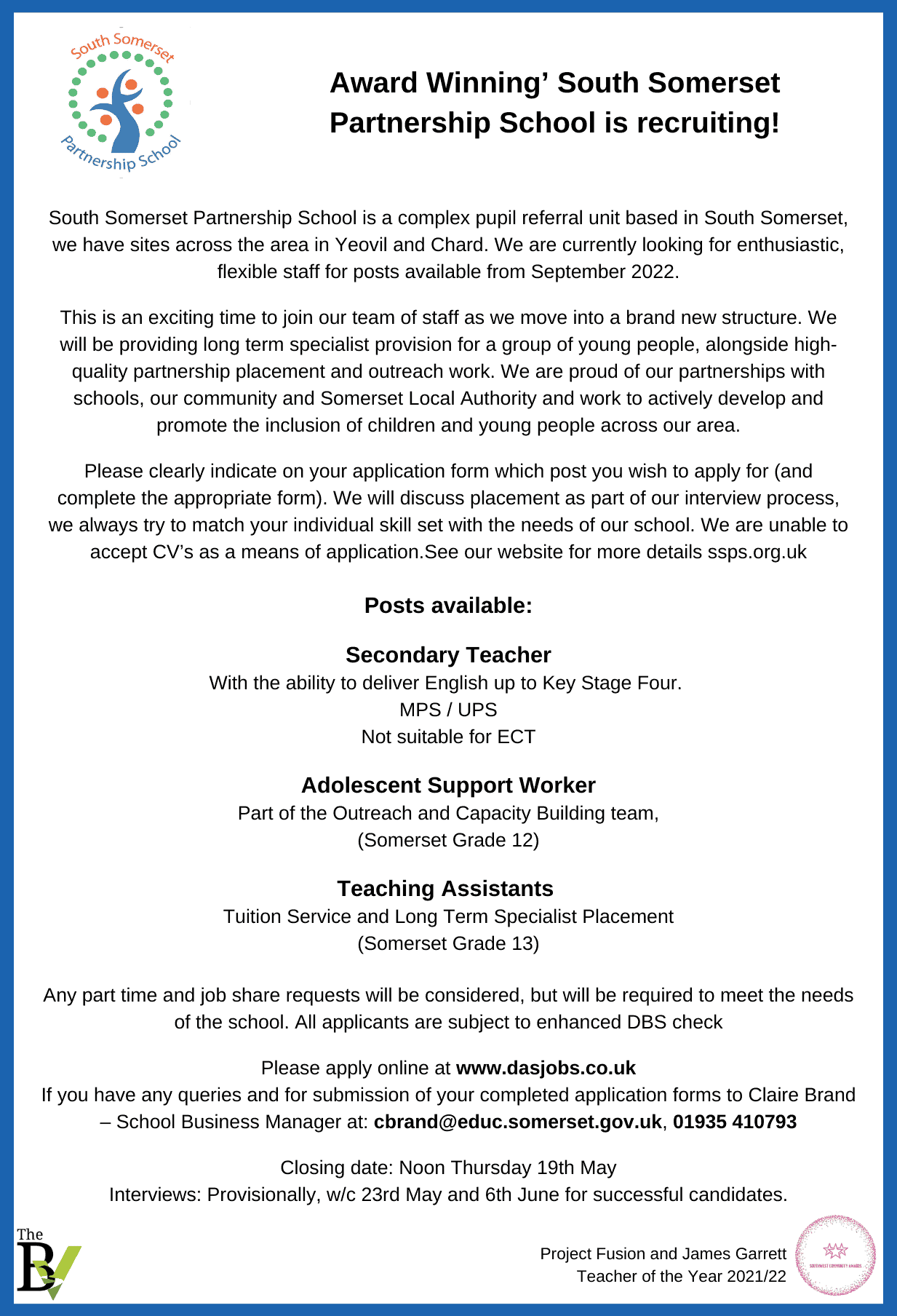 South Somerset Partnership School is a complex pupil referral unit based in South Somerset, we have sites across the area in Yeovil and Chard. We are currently looking for enthusiastic, flexible staff for posts available from September 2022.