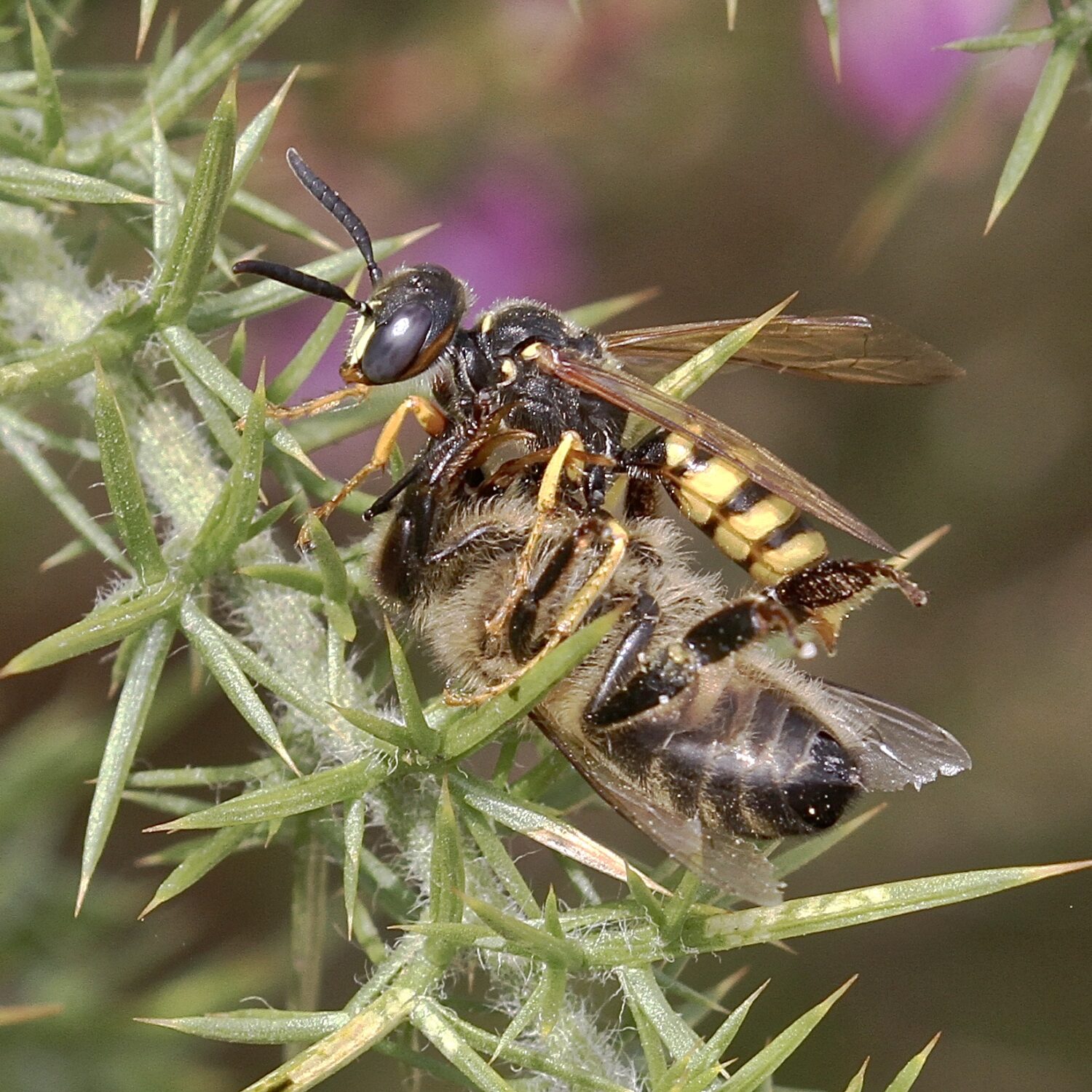 Beewolf This large and impressive solitary wasp was once considered an extreme rarity in Britain, but since the 1980s there has been a huge expansion of its range and it is now a familiar sight among Dorset’s heathland fauna. The female beewolf captures honeybees and carries them under her body back to the nest burrow to feed the developing young.