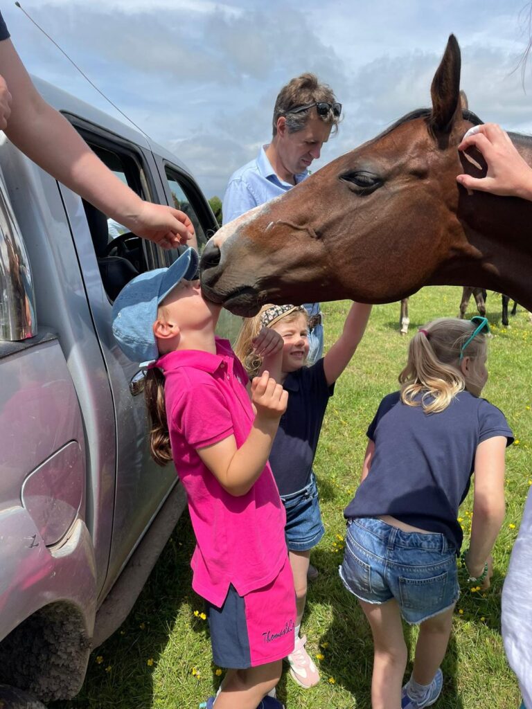 The safari The next visit was far more daunting … The Blackmore and Sparkford Vale Pony Club Foal Safari! This was a visit that had originally been initiated several years ago when Lucy was DC of the branch. Once again I was home alone: this time Lucy was taking a mare to be covered by a stallion called Cracksman – a successful son of the great Frankel, standing in Newmarket at the Darley-owned Dalham Hall Stud. I knew Tea and cake were not on the agenda for these particular visitors, so it was straight into the barns where I was kept busy answering questions – from both parents and children – about all aspects of breeding and foaling. Finally we were on to the really exciting bit they had all come for – the Safari! Once all the Pony Clubbers had been loaded into the back of two pick-ups (think sardines and tins), our son Will and I drove the trucks up the track. Again I provided my commentary on the mares and foals in each paddock as we went, but the best bit was obviously saved for our arrival at Oaktree again. We drove right in among the mares and foals who, having apparently read the ‘be nice and cuddly’ memo, all quickly came over to say hello.