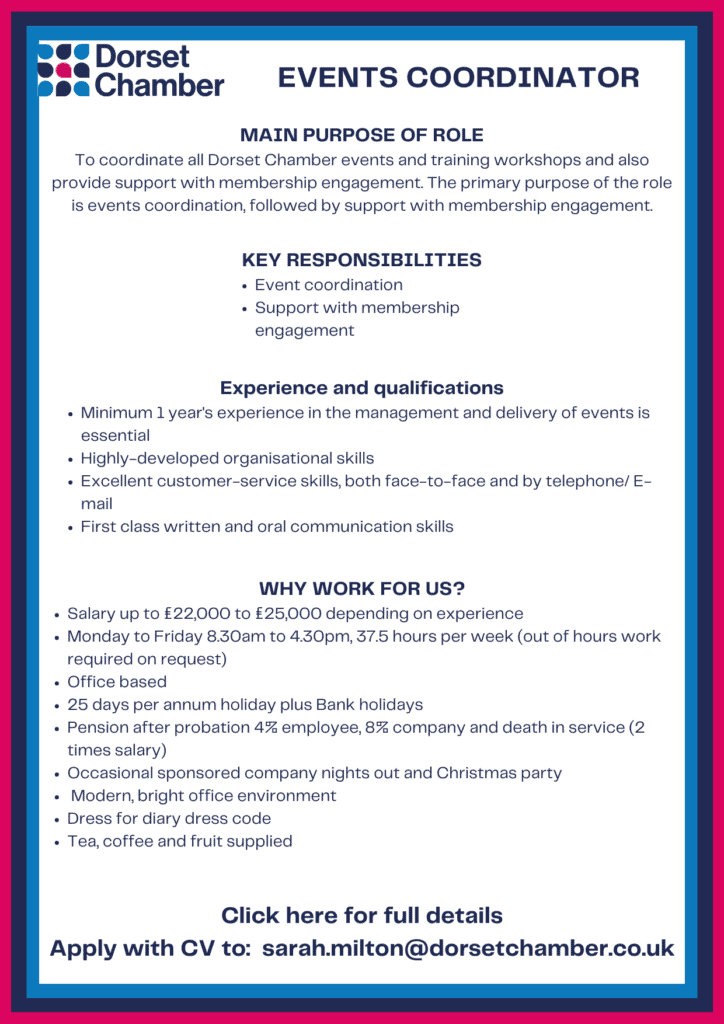 To coordinate all Dorset Chamber events and training workshops and also provide support with membership engagement. The primary purpose of the role is events coordination, followed by support with membership engagement.