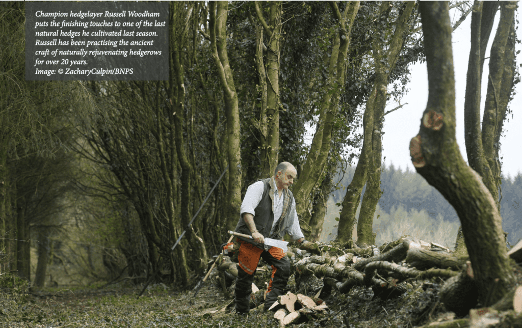It’s an idyllic winter rural scene. Log fire roaring in his grate. Dogs sprawled at his feet. He sits with a sewing needle… methodically extracting vicious blackthorn spikes from his scratched arms. For Russell Woodham, this is just one of the hazards of being a hedge-layer.