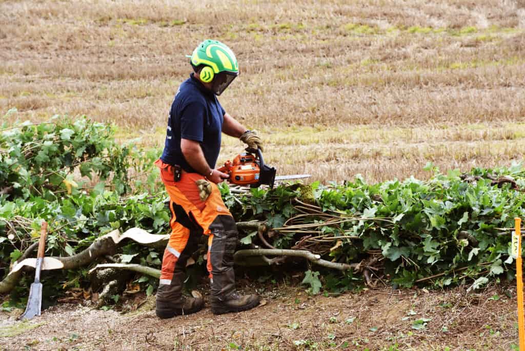 The man demonstrating turned out to be a tutor at Kingston Maurward College. Russell enrolled in March 1999, leading to a mid-30’s career change he’s never regretted. His very first job was a 261 metre-long blackthorn beast. “I think it was a test to see if I was cut out for this occupation!” he recalls. The following year, he entered the novice class at the Melplash Agricultural Society, winning first in his first competition. Twenty-two years later he’s entered close to 50 competitions and been overall champion in many. He was the first Dorset Hedgelayer to be invited to Highgrove to meet HRH Prince Charles, Patron of The National Hedgelaying Society. He runs training days and is Committee member of the National Hedgelaying Society. Russell keeps meticulous records of every hedge makeover. Over 20 years, he’s regenerated 25,606 metres of hedgerows, the longest measuring a staggering 1,038 metres, and in one winter can expect to layer around 3,000 metres.