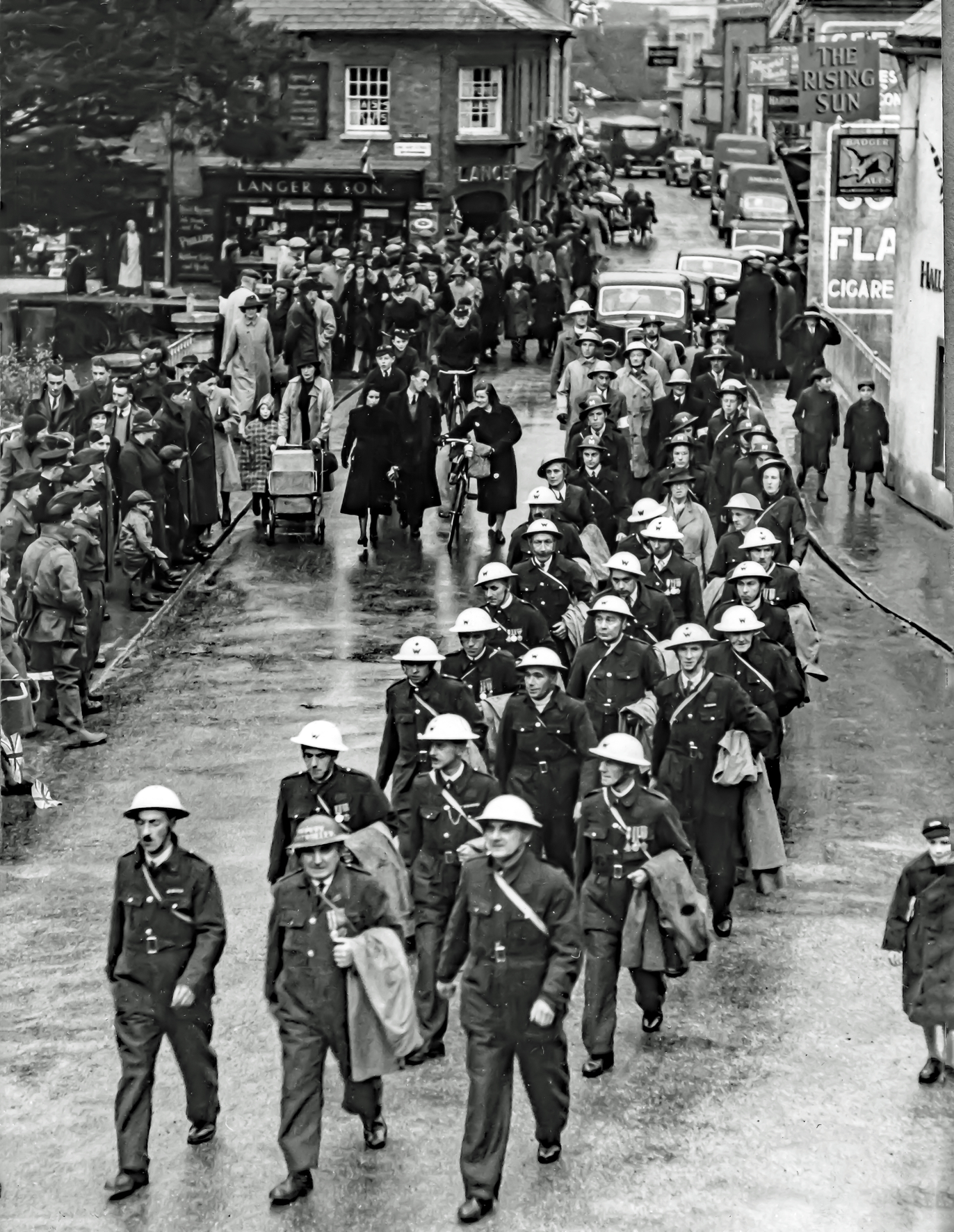 Wimborne Air Raid Precautions (ARP) wardens taking part in the 1941 parade for National Savings Warship Week, led by Bill Tapper’s father who was head Air Raid Warden. He is flanked by Mr Stewart and Mr Greaves, respectively the Urban District and Rural District ARP officers