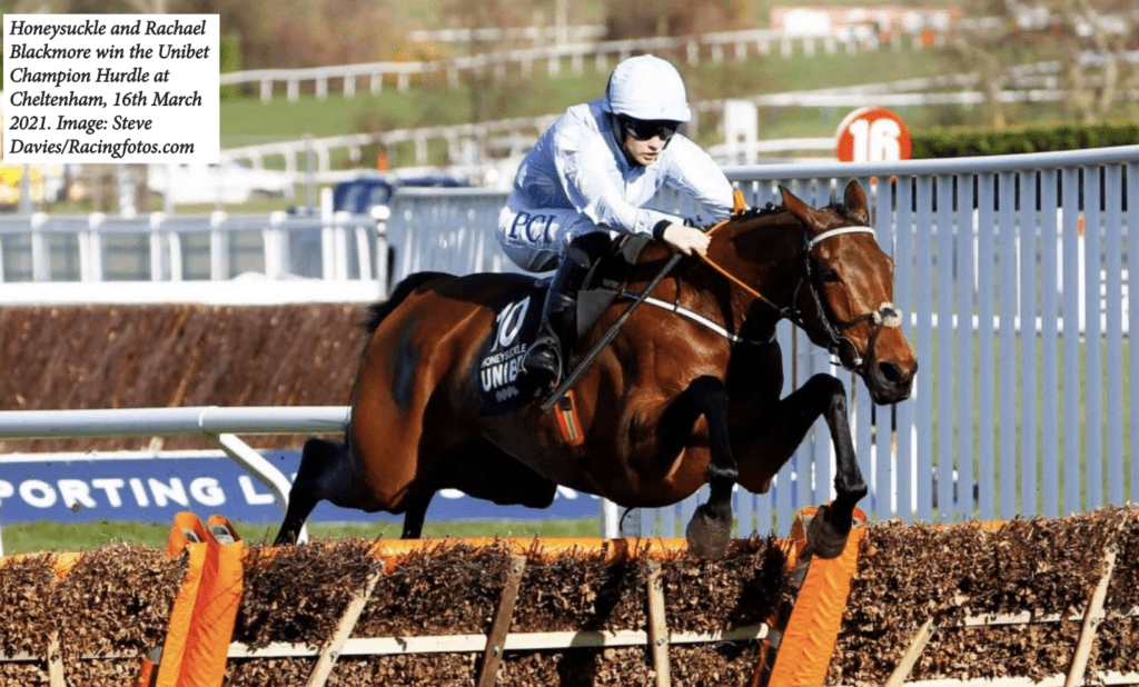 Seven-year-old Honeysuckle is from Glanvilles Wootton, just outside Sherborne, bred by Dr Geoffrey Guy and Guy’s co-owners and managers of The Glanvilles Stud, Doug and Lucy Procter. She ended the 2020-21 season unbeaten.