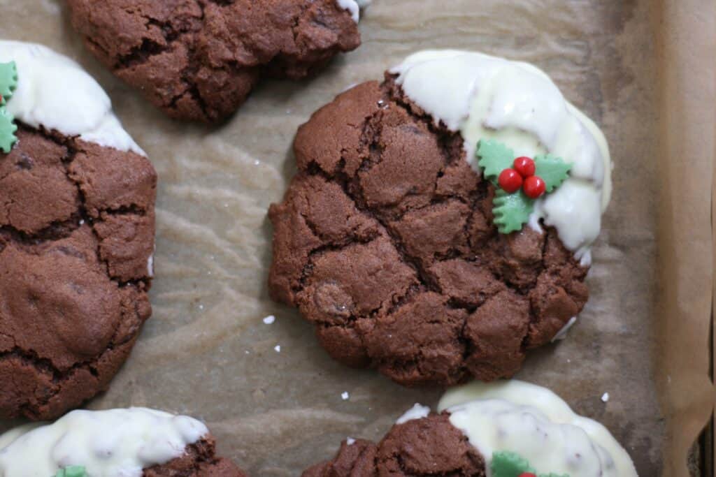 When cold, melt the white chocolate in a bowl and dip one side of the cookie into the white chocolate so that it looks like a Christmas pudding. You can finish with a fondant holly sprig and berries if you wish.