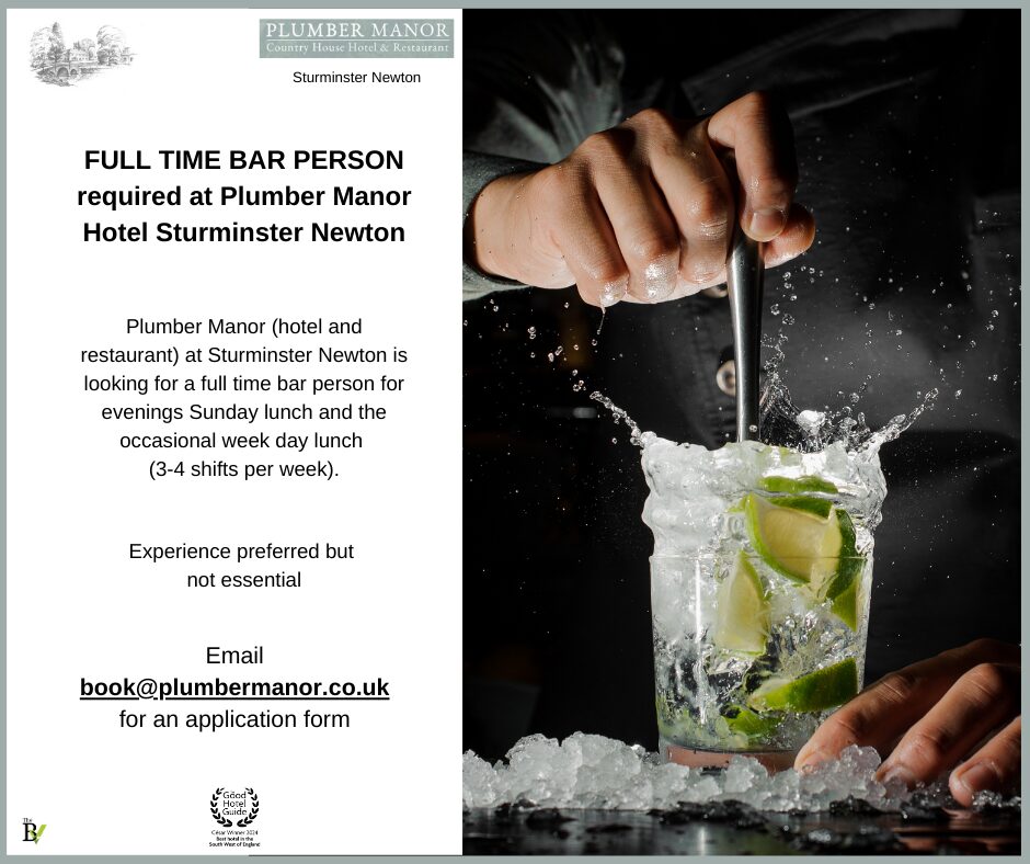 Plumber Manor (hotel and restaurant) at Sturminster Newton is looking for a full time bar person for evenings Sunday lunch and the occasional week day lunch. (3-4 shifts per week).