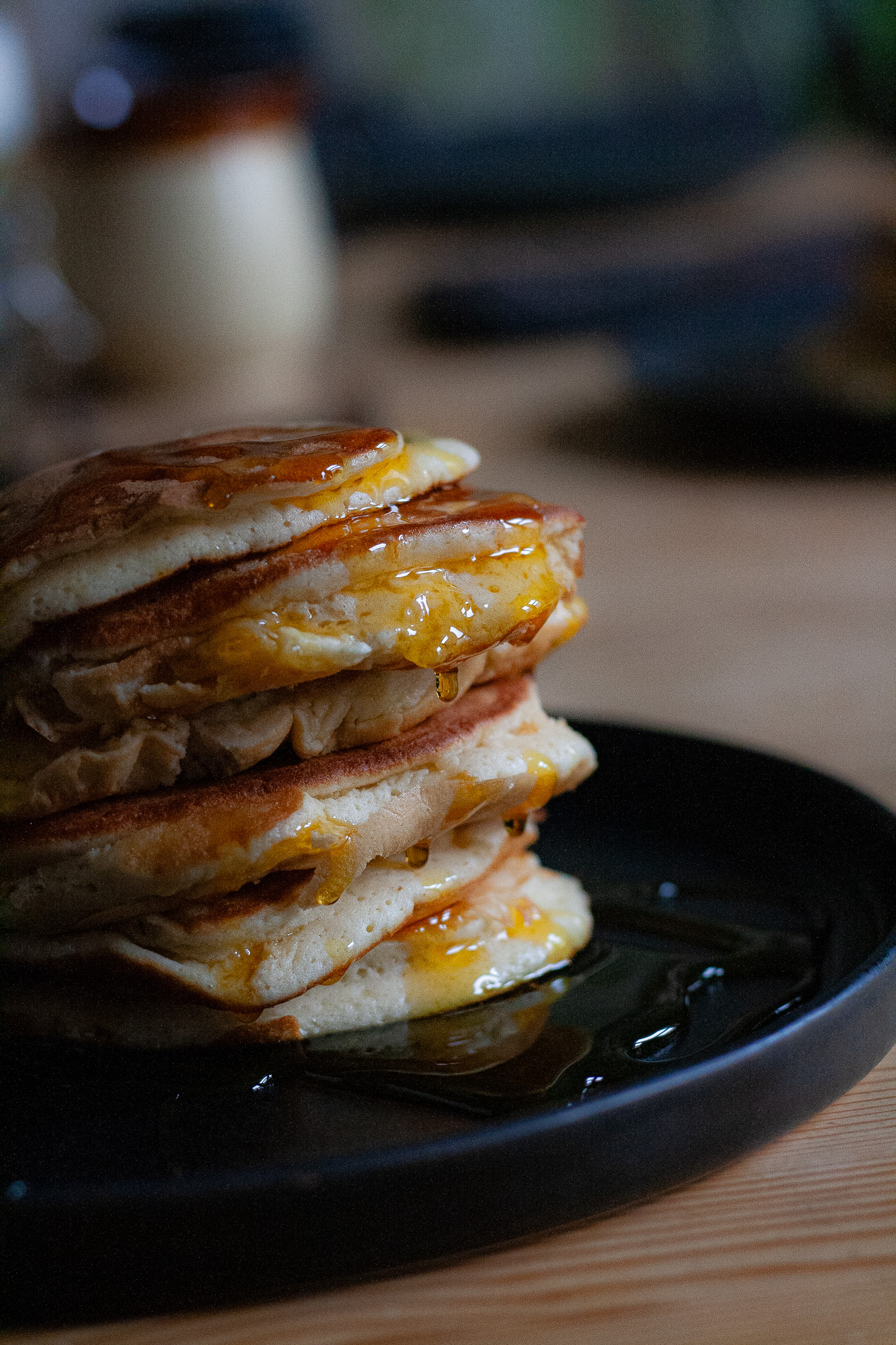 I’ve always been intrigued by the super-fluffy, almost soufflé-like pancakes that grace my social media pages, and have been on a quest to try to replicate something similar in my home kitchen – albeit in a much simpler fashion. These fluffy pancakes aren’t quite as complicated to make as some, but the result is a wonderfully light, almost melt-in-your-mouth pancake, perfect for some delicious golden syrup or fresh fruit and cream. I have used lime juice here for some acidity, but you can use lemon juice if you prefer. You also need a frying pan with a lid – if you don’t have one, just make a temporary one by using a baking tray instead! Heather x
