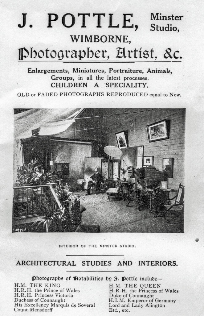 He recorded the floods of 1894 and also suffered an injury helping to catch two women who leapt from a blazing building in East Street but he still photographed the charred remains of the shop. He documented Wimborne’s celebration of Queen Victoria’s diamond jubilee in 1897 and photographed King Edward VII’s visit to Crichel in 1909. Later, having photographed many important Royal visitors to nearby Crichel House – you can see the impressive list on his advert – he renamed his business Royal Studio.