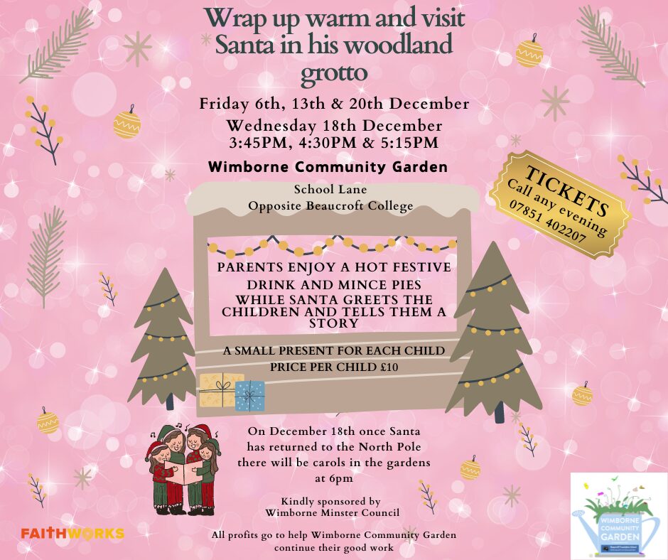 Wimborne Community Garden is thrilled to announce its Santa in the Garden Grotto: children can visit Santa in his woodland grotto, listen to a magical story, and receive a special gift. Families will also enjoy a beautifully lit walkway through the garden, and parents can relax with a hot drink and a mince pie while the children meet Santa. Spaces are limited, so early booking is recommended. For tickets, call 07851 402207 (evenings only). All proceeds will help the award-winning garden continue its mission of providing fresh produce to Wimborne Food Bank, Wimborne Community Kitchen, and Beaucroft College’s café. Wrap up warm and join them for an enchanting Christmas experience! Friday 6th, 13th and 20th December Wednesday 18th December 3.45pm, 4.30pm & 5.15pm £10 per child Wimborne Community Garden, Top of School Lane, Wimborne BH21 1HQ