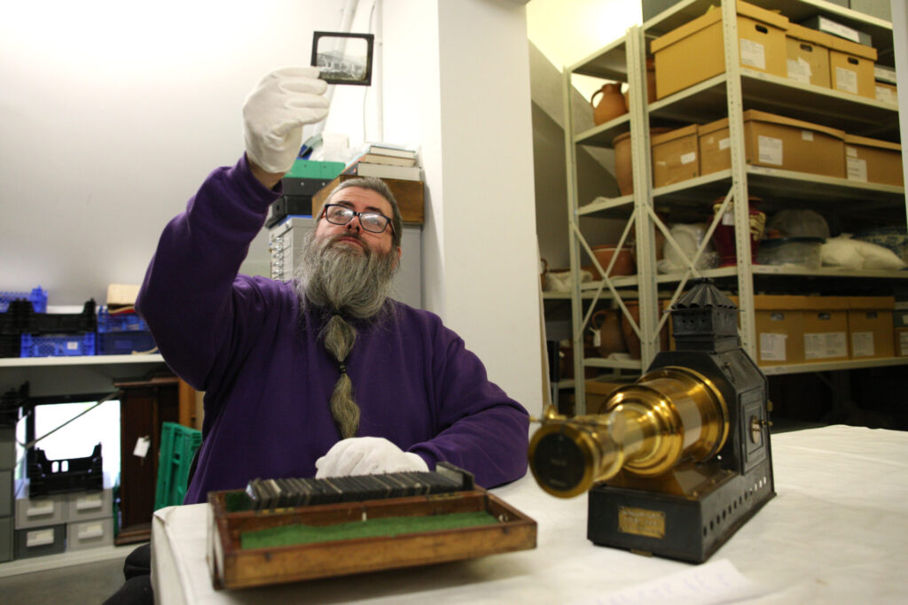 One of Rob’s many jobs is painstakingly cataloguing and digitalising every single item in the museum’s archive – that’s around 40,000 pieces. Here, he’s examining slides for the 19th century magic lantern on the table