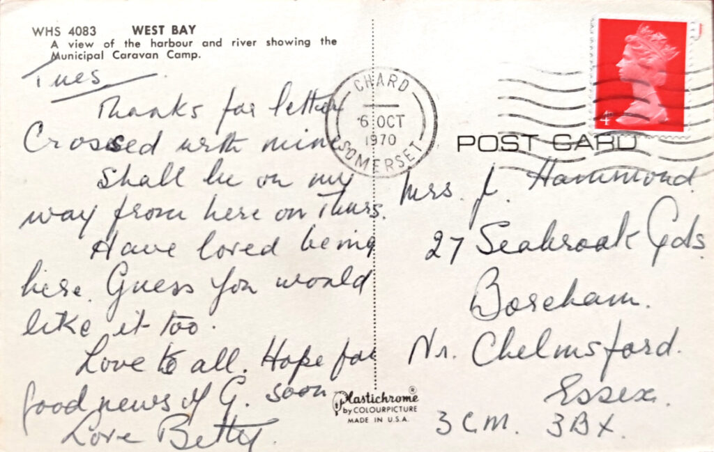 This month Barry Cuff has chosen two postcards more modern than usual, and scenes no doubt familiar to older locals. Both were sent by holidaymakers on the coast – Charmouth and West Bay.