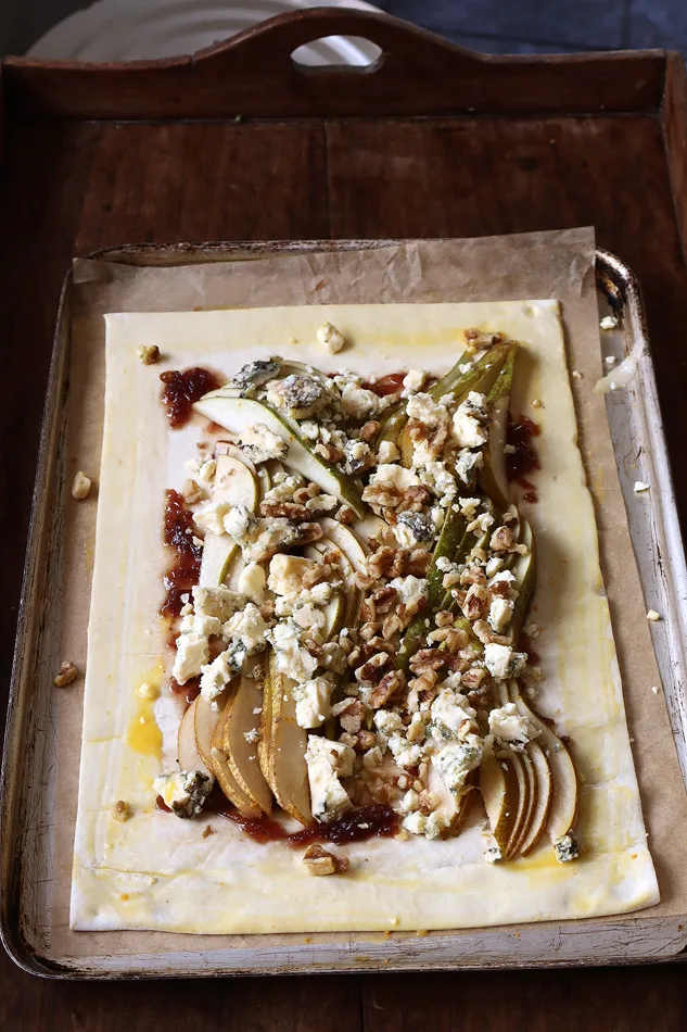 1. Unroll a sheet of ready-rolled puff pastry onto a lined baking tray.