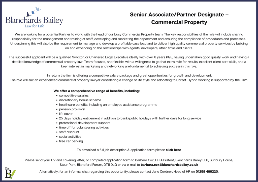 The role will suit an experienced commercial property lawyer considering a change of life style and relocating to Dorset. Hybrid working is supported by the Firm.