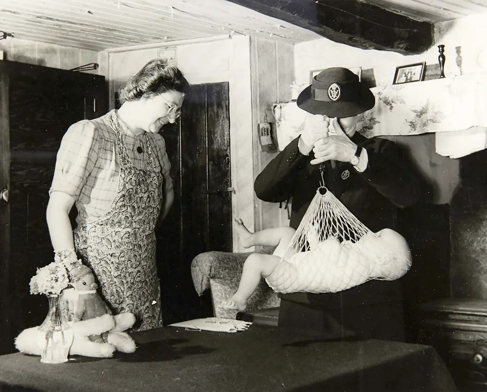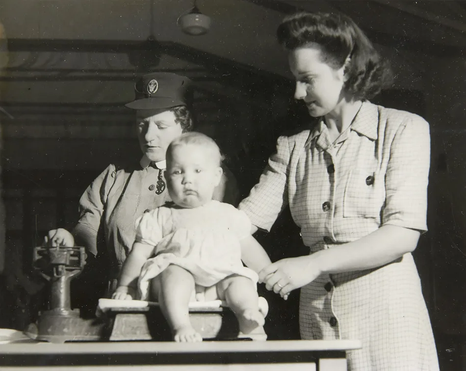 Here Nurse Nightingale, the District Nurse, is weighing six-month old, fair-haired, blue-eyed Barry Wilkinson, while attractive Mrs Wilkinson, herself a Sydling girl, holds her baby son.