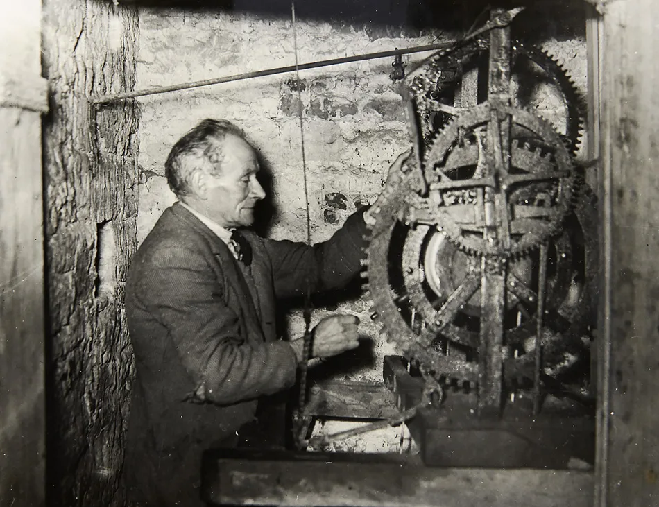 Every day Mr Sherry mounts the steps of the parish church of St Nicholas tower to wind the old Elizabethan clock. For this he is paid 1 1/2d [a penny ha’penny]