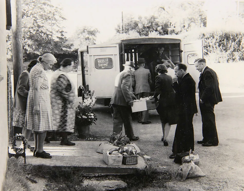 Annually the Dorset Village Produce Association holds a competition, and here (from left to right) is Mrs Bowditch, Miss Ridout, Mrs Palmer, Mr Hallett, Mr Kellaway, Mrs Bowring, Mrs Hallett, Mr Bowring and Mr Bowditch, packing up the produce for the competition which was held in Weymouth.