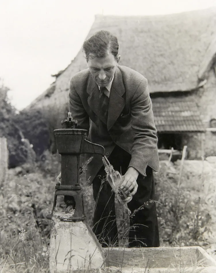 Sydling St Nicholas is dependent for most of its public services on Dorchester, County Town of Dorset. Here, Mr B R Swift, Assistant Sanitary Inspector of the Dorchester Rural District Council, is taking a sample of well water to test for purity.