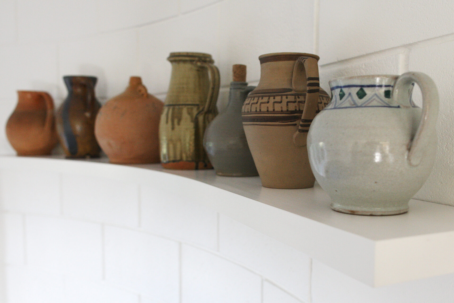 On the other side of the dining alcove, a high shelf displays a series of pots and jugs telling the story of Dorset pottery. There are several old pieces from the Verwood pottery, makers of earthenware from the early 1600s until 1952. They include an example of the most famous Verwood product – the Dorset Owl or Costrel, a flask with lugs, used by farm labourers to take cider or cold tea into the fields.
