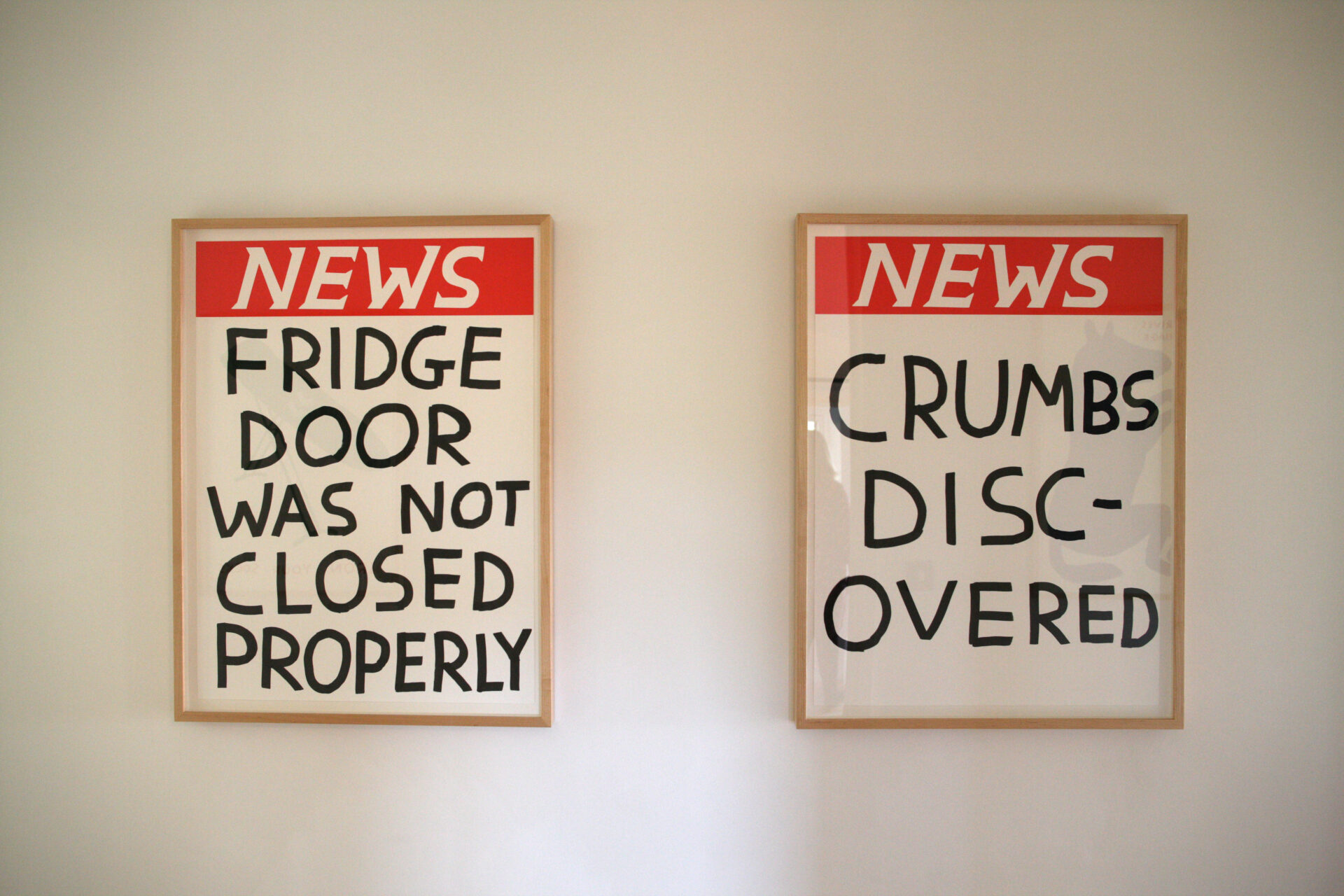 A series of quick-witted drawings by Devon artist David Shrigley lines one side of the circular dining area in the kitchen. Shrigley is best known for distinctive works with black capital letters making satirical comments on everyday situations and human interactions. Their deadpan humour repeats phrases like snippets of overheard conversations.